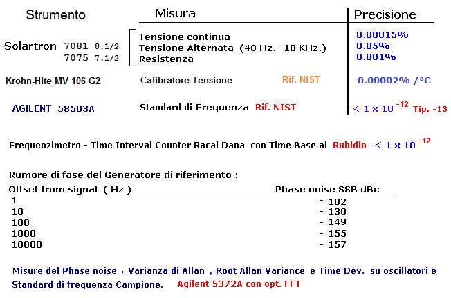 Il contatore Reference di Time Interval , Frequenzimetro, misuratore di Standard Deviation, Phase Noise, Root Allan Variance, Allan Variance e Jitter Analysis è Agilent - HP 5372A opt. 40 FFT con Time Base ad oscillatore atomico. Misura fino a 2 GHz.